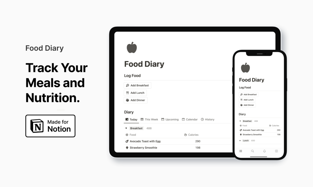 Effortlessly track your daily calories and nutrition and plan your meals with this Notion template.