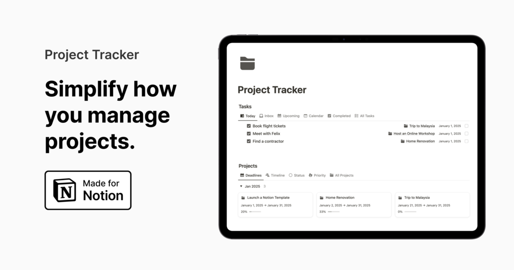This one-page Notion setup with just two databases removes complexity and simplifies managing your projects, their progress, and next steps.